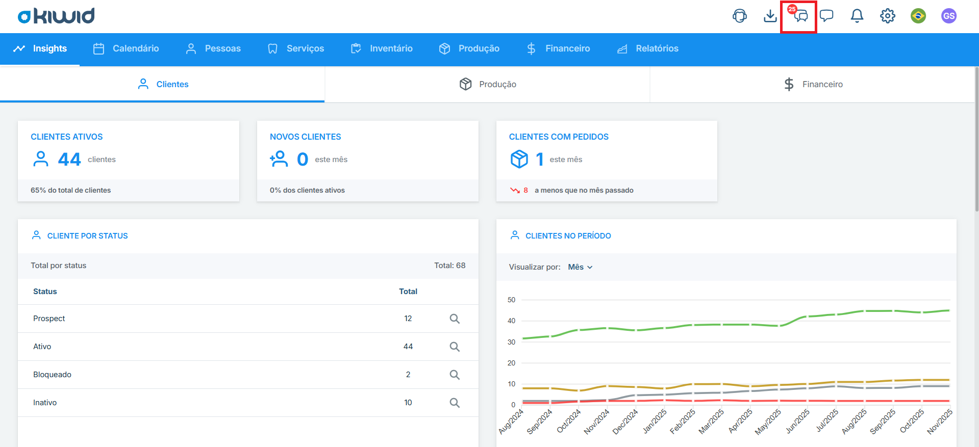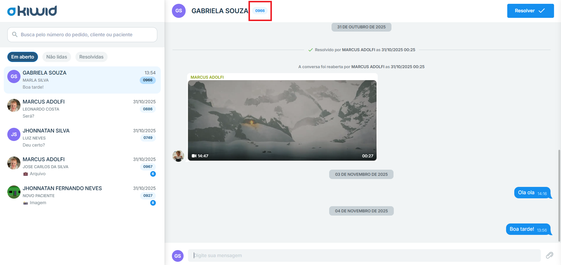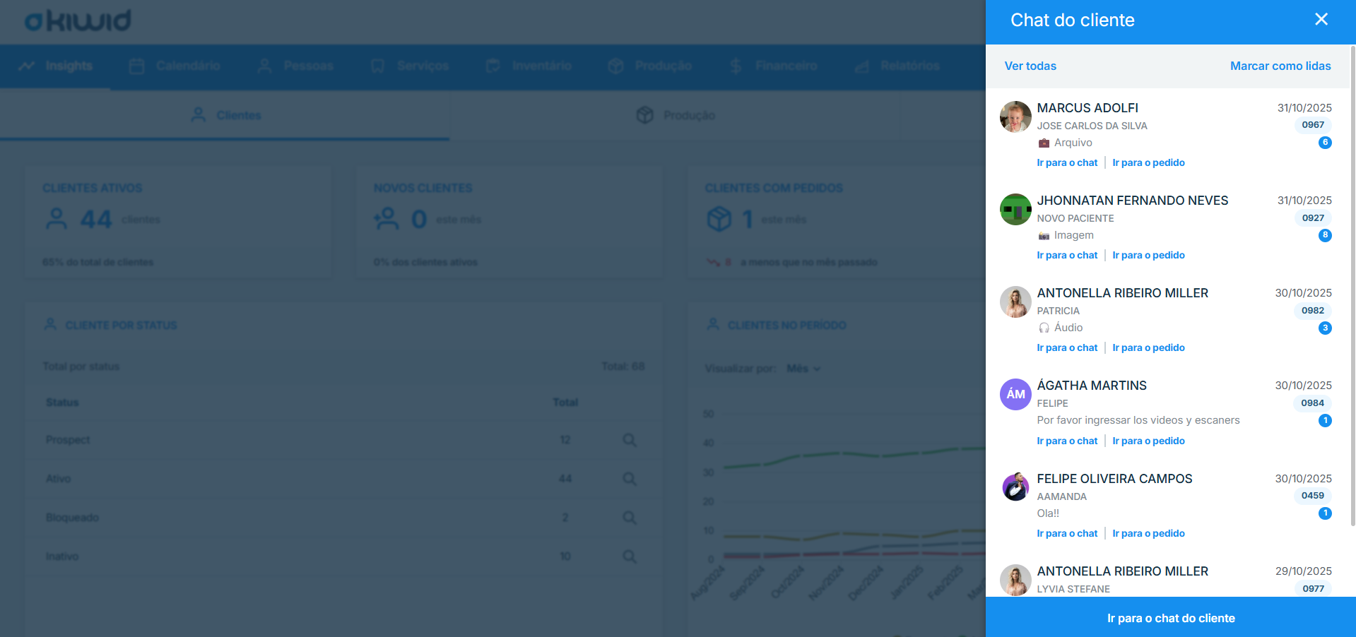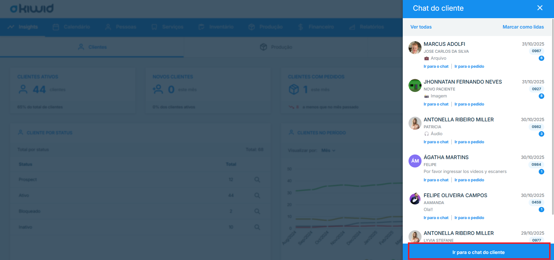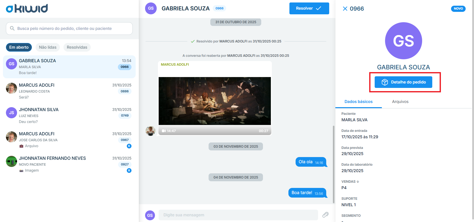 Dentro do pedido temos a opção de chat, que fornece uma comunicação direta entre o laboratório e o cliente que realizou o pedido, caso ele tenha conta no app Kiwid Clinic (para saber como se cadastrar no app Kiwid Clinic clique aqui).