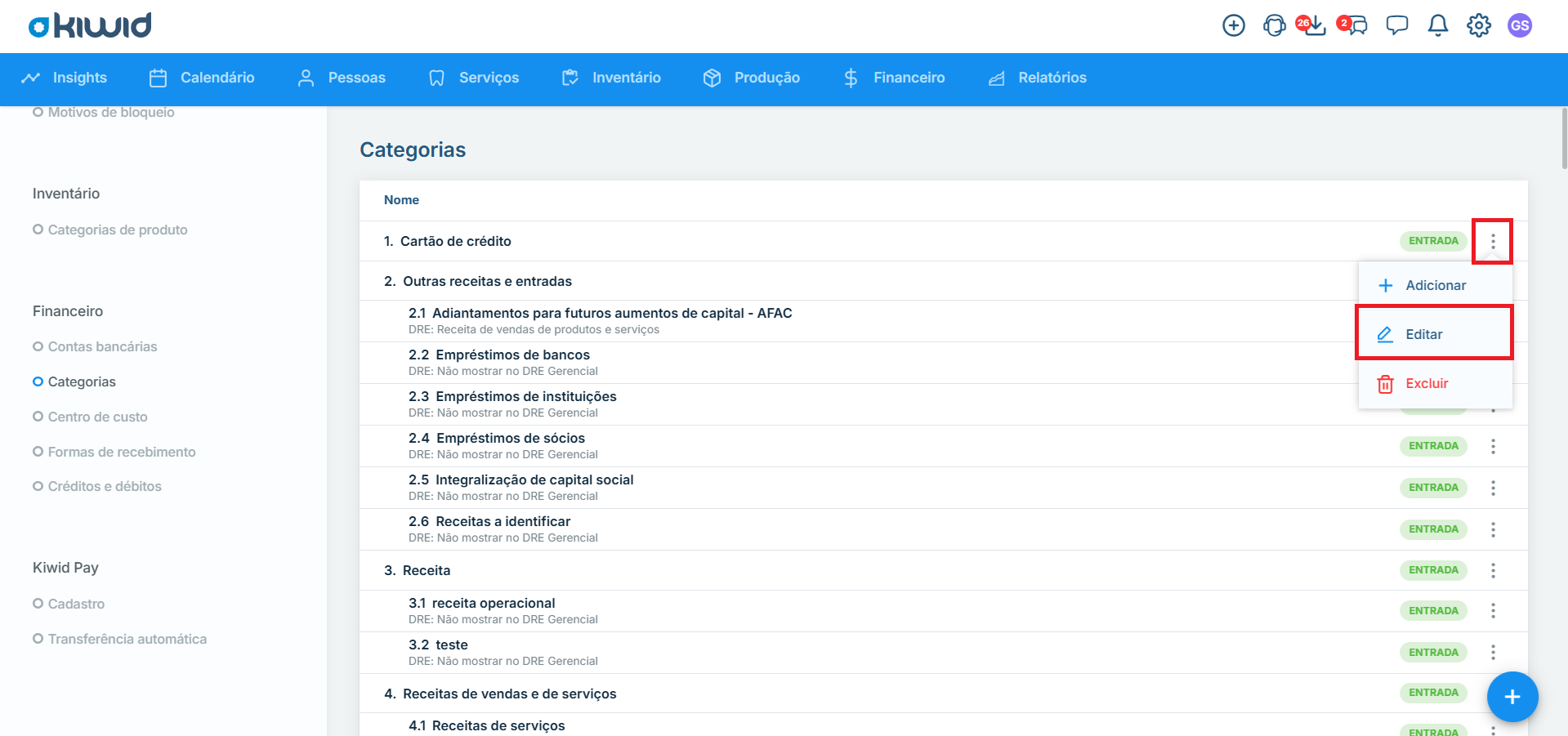 • Para Para editar basta clicar nos três pontinhos da categoria desejada, selecionar Editar, realizar as alterações necessárias e, por fim, clicar em Salvar;
